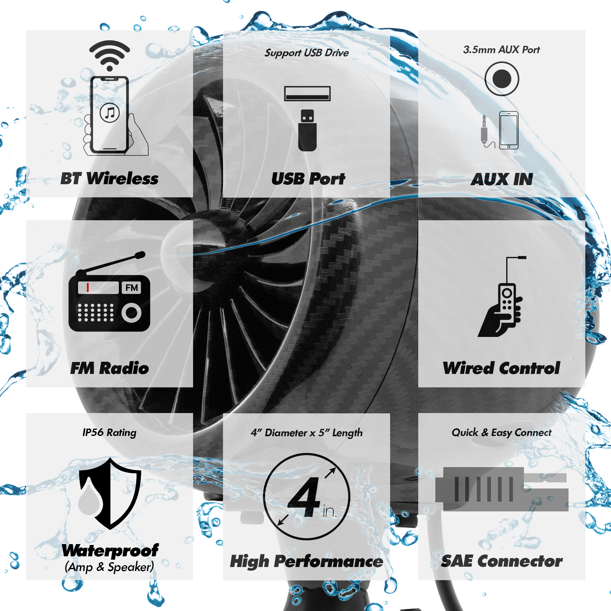 - Advanced IP56 Water-Resistant Design (Amp & Speaker). Superb Crystal Sound Quality. Great for outdoor use. Easy Installation: Comes with all necessary hardware and wiring. Included 78″ Long SAE to Ring Terminal Power Cable. Plug and Play. Standard 12V Power Connection.